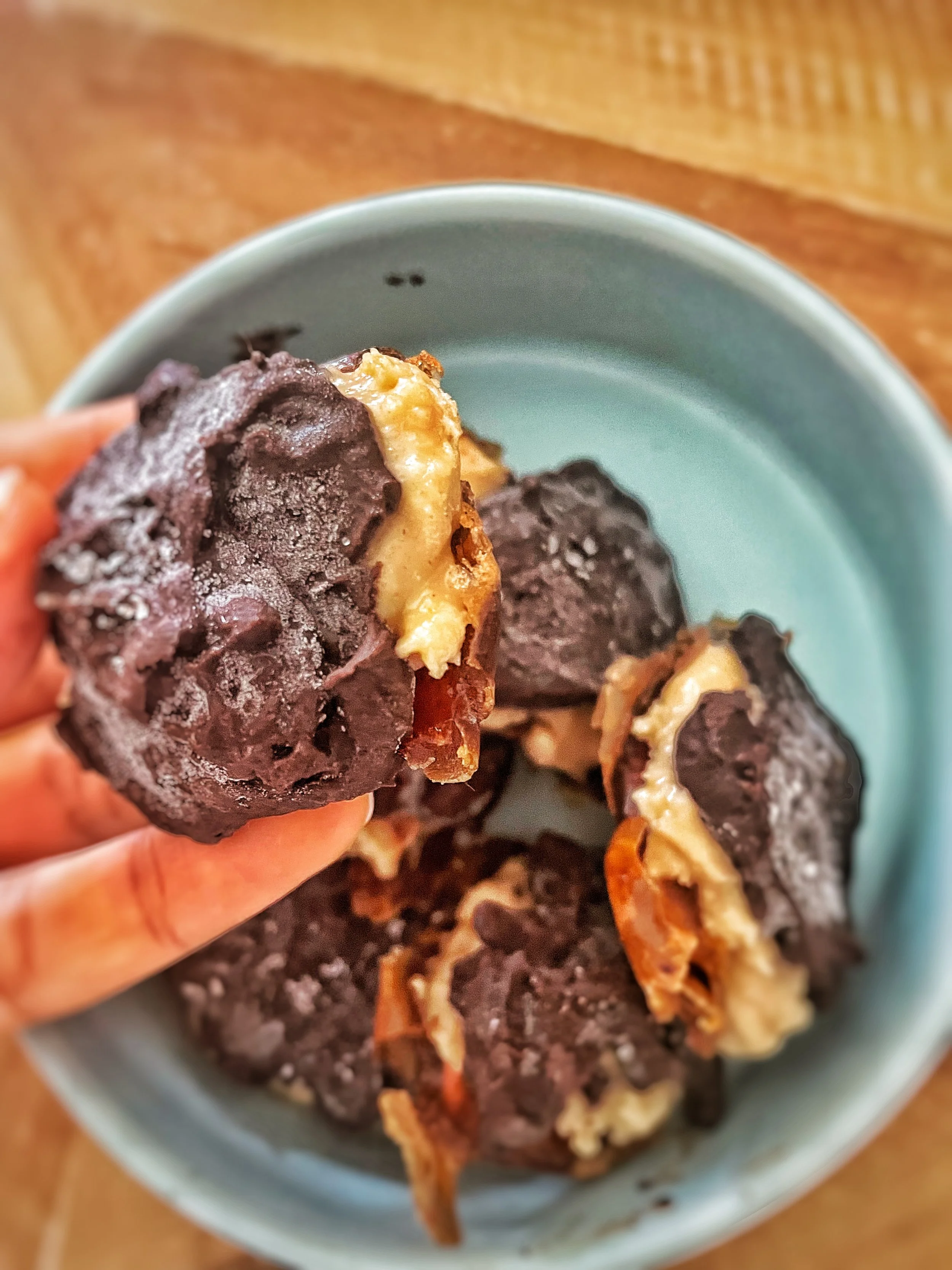 Drizzle or spoon melted chocolate over each cluster so it partially covers the date + peanut butter layers (allowing gooey bits to peek through).